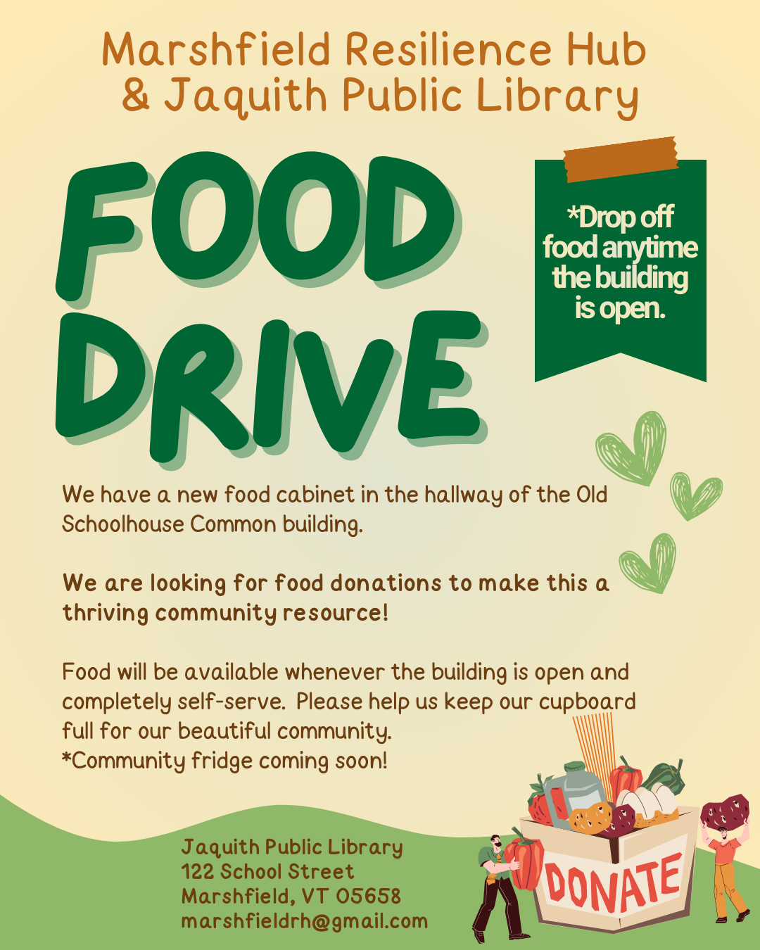 Located in the upstairs hallway of the Old Schoolhouse Common Building, the Marshfield Resilience hub & the Jaquith Public Library operate a passive system food cabinet that is available to all. Open whenever the building is, take what you need, donate when you can.
